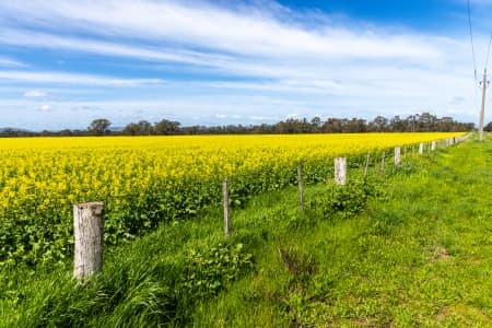 Aerial Photography A vibrant yellow canola field stretches across the landscape in Mangalore, Victoria, Australia, under a clear blue sky - Airview Online